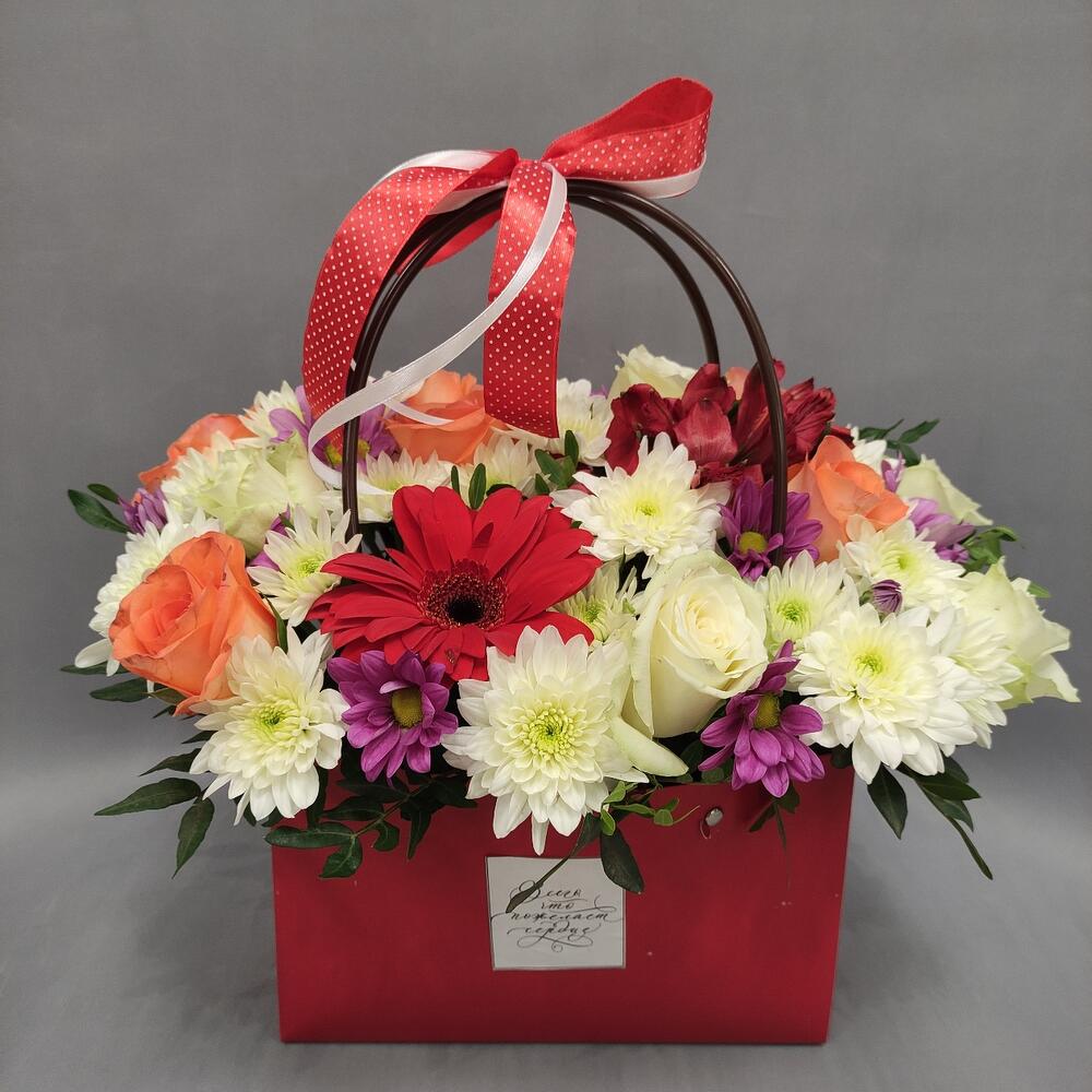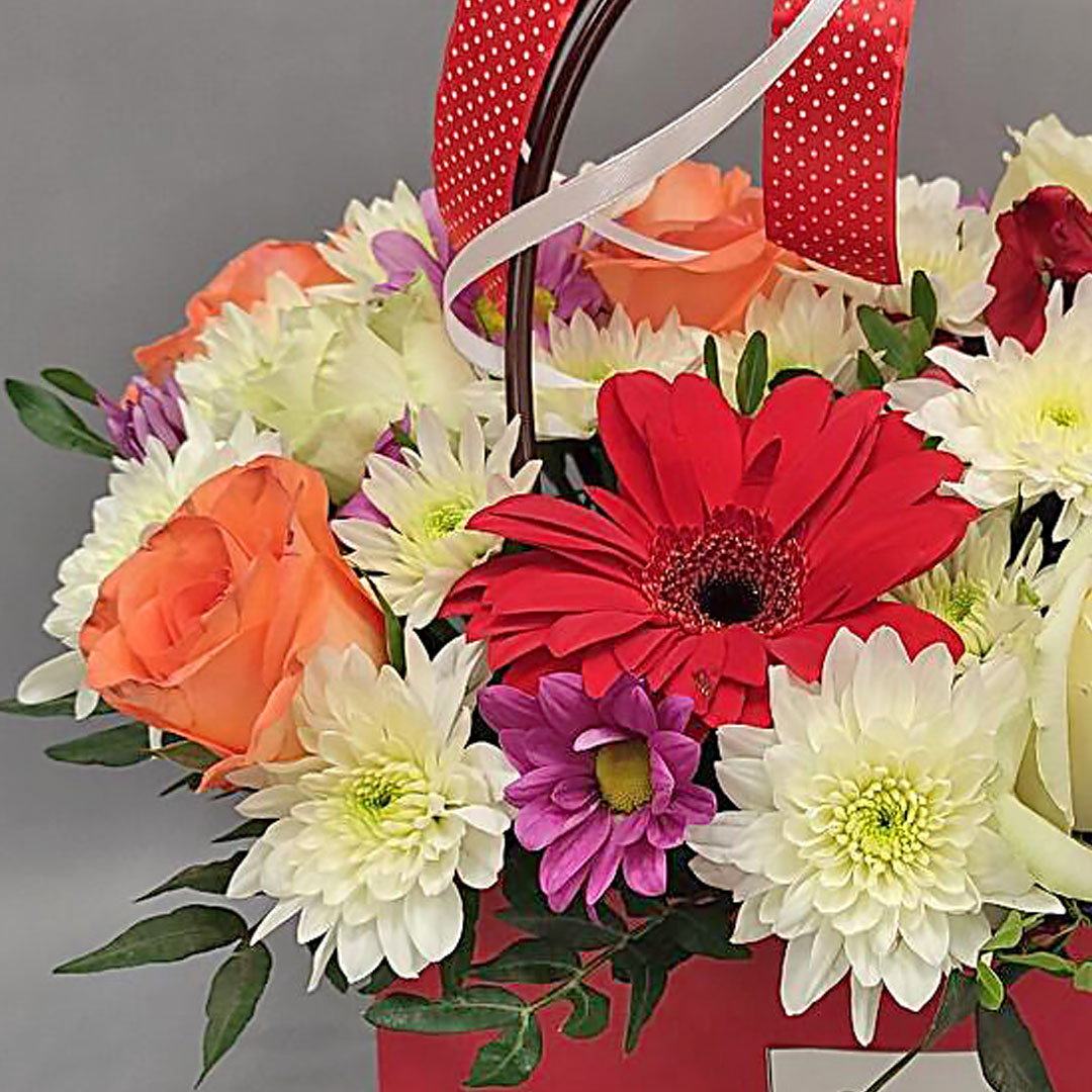 • Корзиночка с цветами "Ариэль" из кустовой хризантемы, кустовой розы и альстромерии арт. 6975