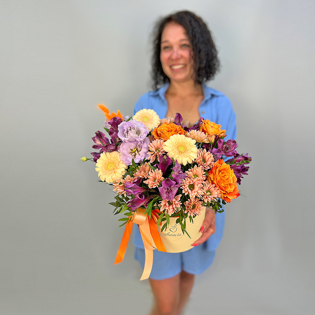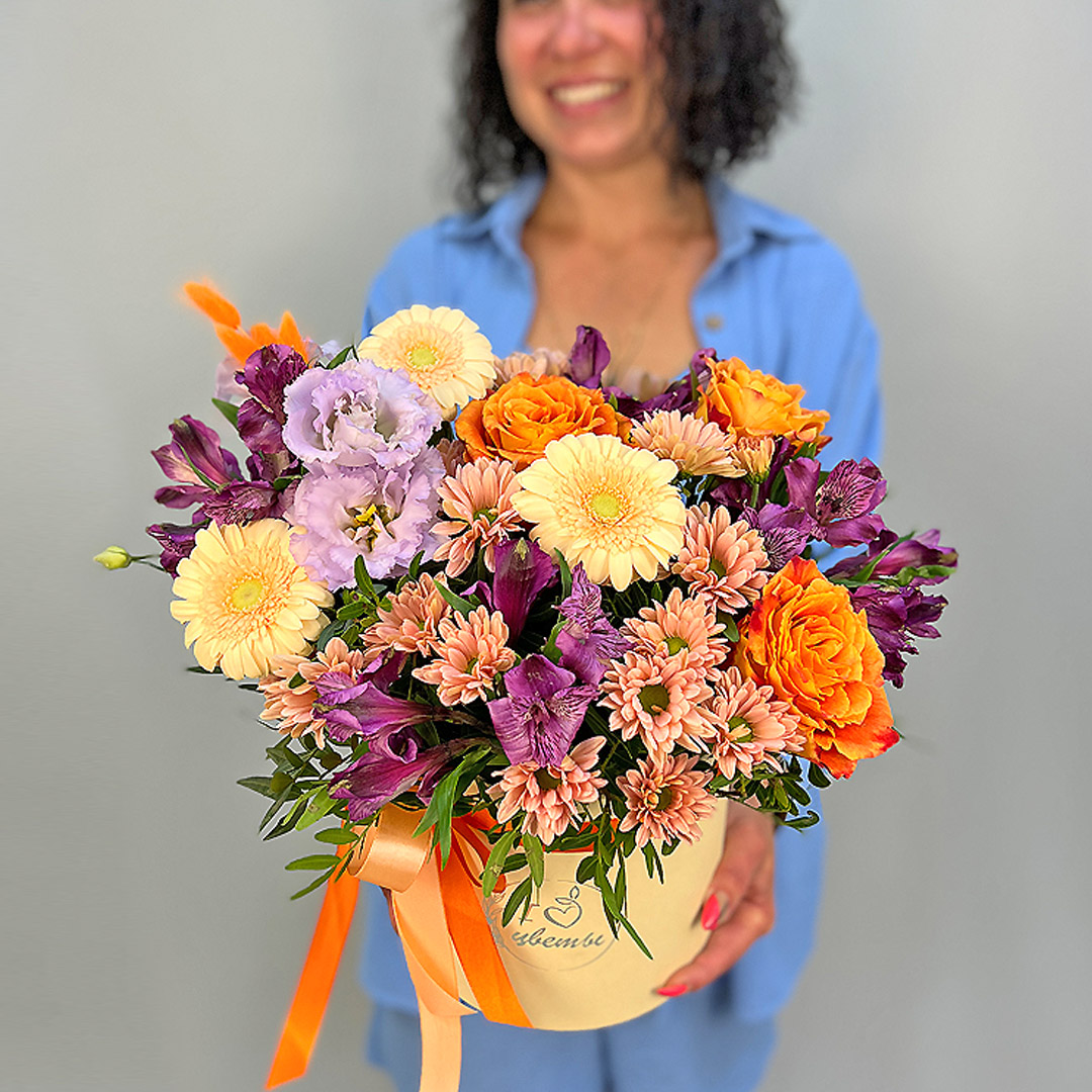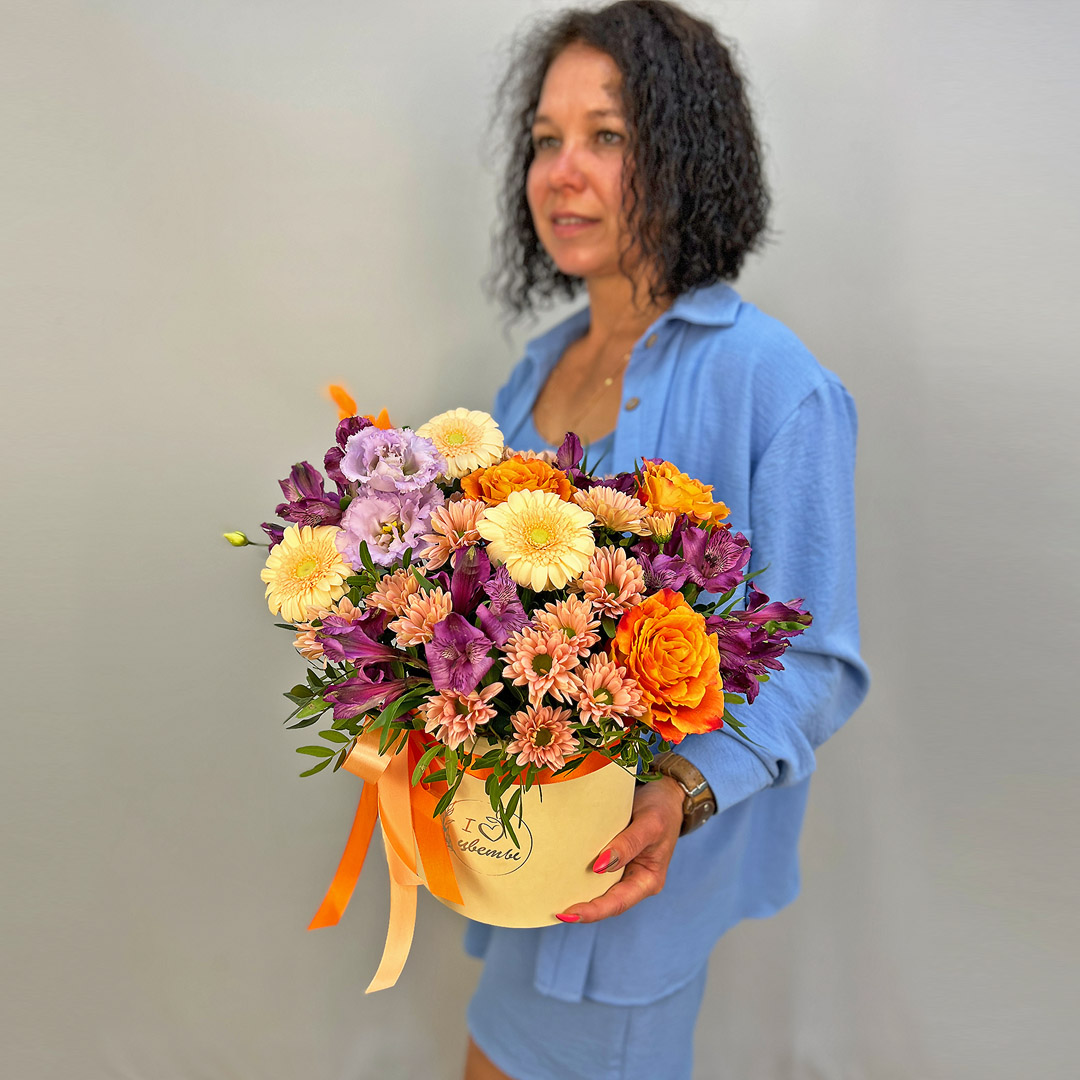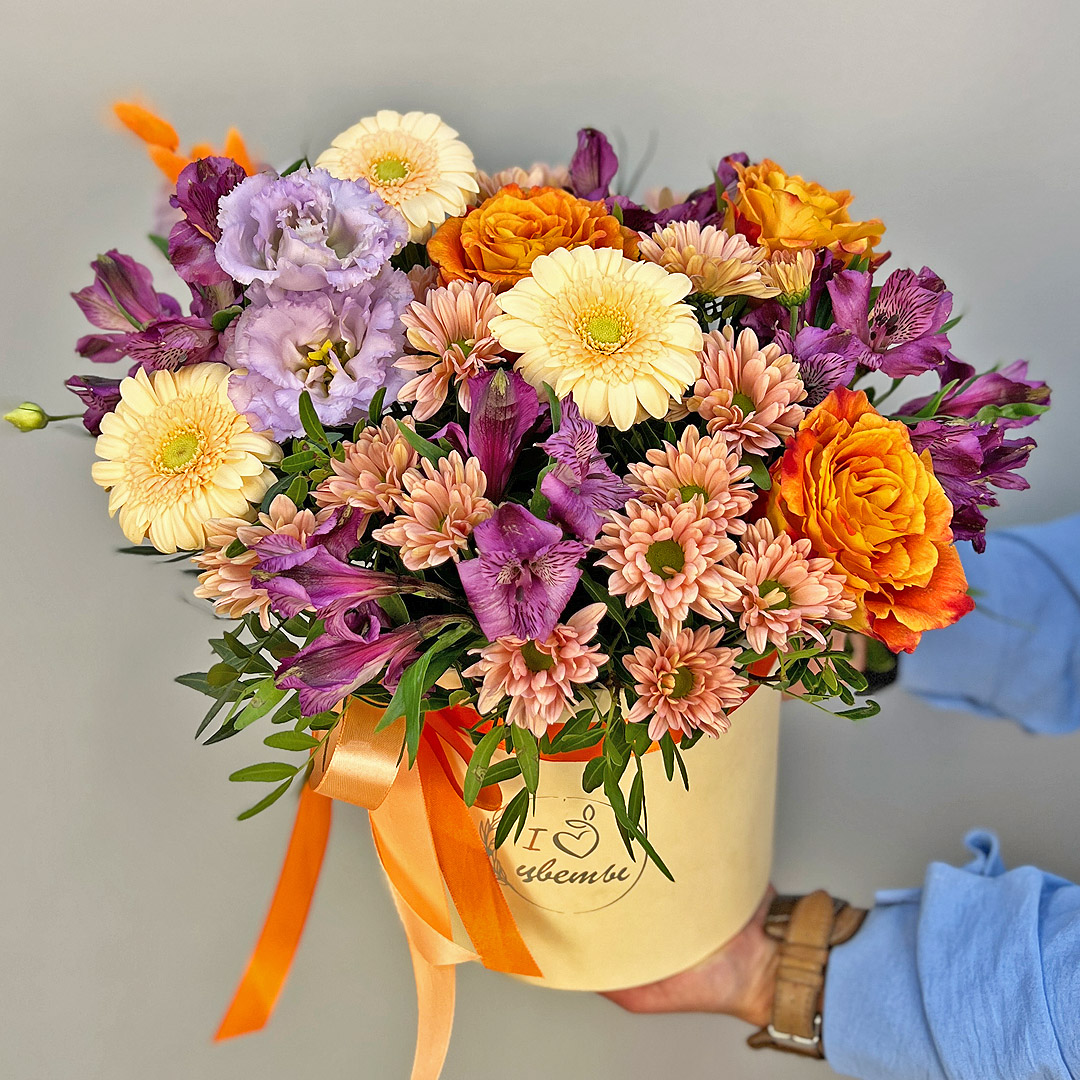 • Коробка с цветами "Тропический коктейль" из Эквадорской розы, эустомы, альстромерии арт. 22456