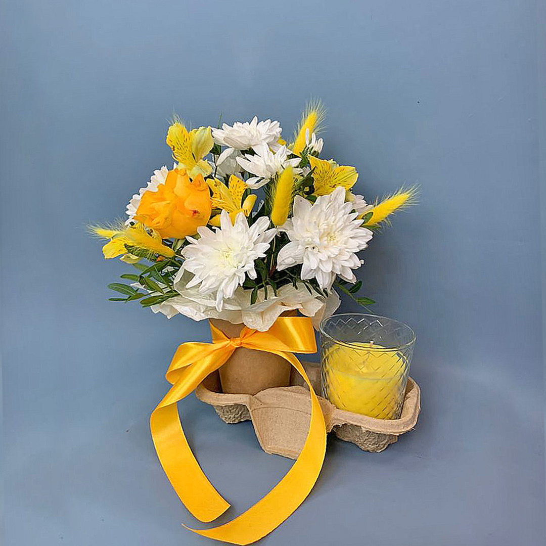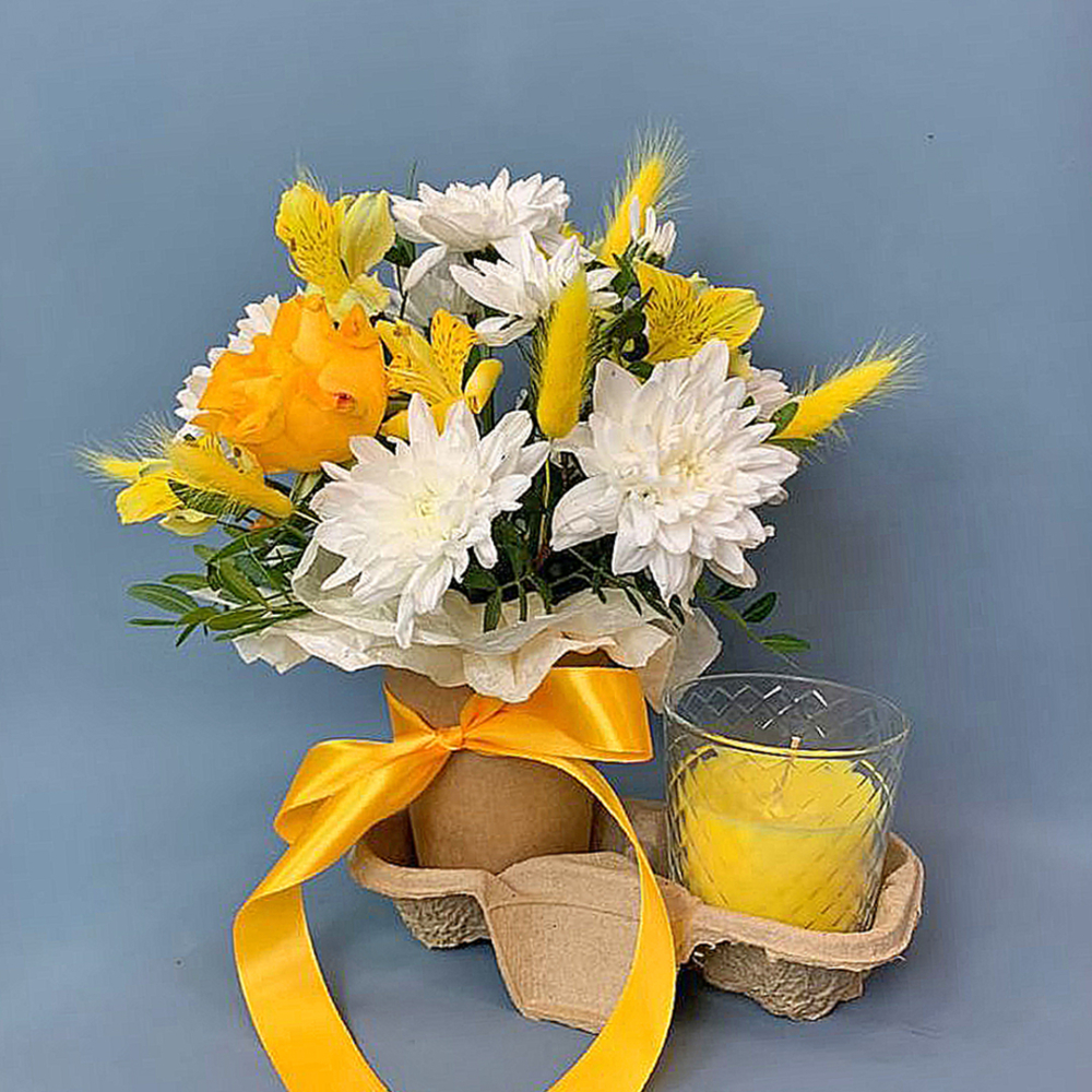 Такой небольшой букет подойдёт, чтобы порадовать коллегу, сделать сюрприз подруге или преподнести в знак благодарности. Он легко впишется в рабочий кабинет, создаст уют на письменном столе или в гостиной. А запах от аромасвечи наполнит комнату приятным ароматом.